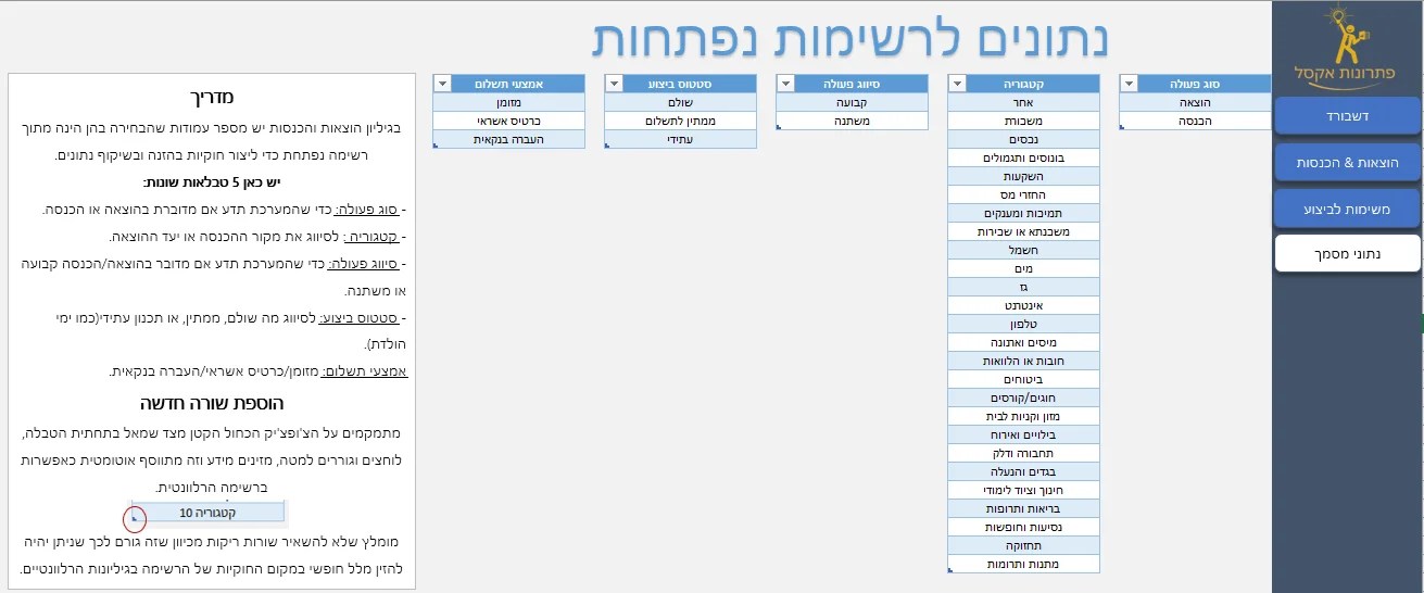 גיליון ייחודי המאפשר הגדרת קטגוריות ותנאים מותאמים אישית בטבלת ההוצאות וההכנסות, כדי לשמור על סדר, עקביות ובקרה פיננסית.